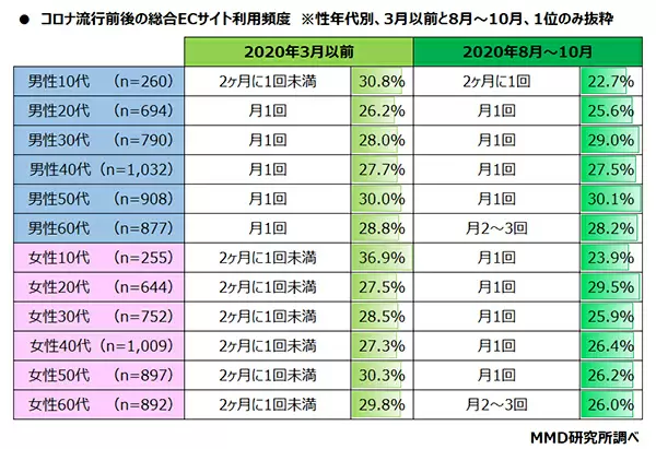 8~10月は、男性の10代と60代、および女性の全年代で総合ECサイトの利用頻度が増加