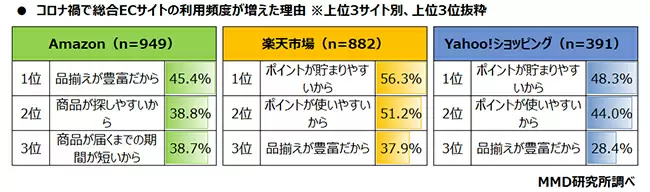 総合ECサイト利用者のうち、4月以降に利用頻度が増えた人(1923人)に、利用頻度が増えた理由を尋ねた質問では(複数回答)、Amazon利用者で「品揃えが豊富だから」「商品が探しやすいから」「商品が届くまでの期間が短いから」、楽天市場利用者で「ポイントが貯まりやすいから」「ポイントが使いやすいから」「品揃えが豊富だから」、Yahoo!ショッピング利用者では「ポイントが貯まりやすいから」「ポイントが使いやすいから」「品揃えが豊富だから」が上位となった。