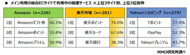 総合ECサイトの関連サービス利用、Amazonでは「Amazonギフト券」、楽天市場では「楽天ポイント」、Yahoo!ショッピングでは「Tポイント」が最多に