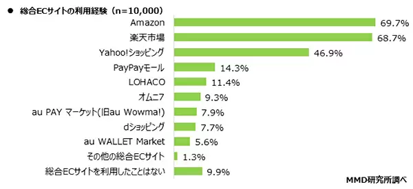 調査対象者に、総合ECサイトの利用経験を尋ねたところ(複数回答)、90.1%が利用経験ありと答えており、利用したことのある総合ECサイトは「Amazon」(69.7%)が最も多く、「楽天市場」(68.7%)、「Yahoo!ショッピング」(46.9%)が続いた。