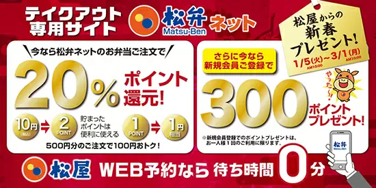 松屋フーズは1月5日~3月1日10時の期間、松弁ネット実施店舗全店で松弁ポイントの「20%ポイント還元キャンペーン」を開催する。