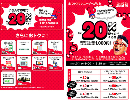 3月1日から実施の「超PayPay祭」は、誰でもどこでもお得になるキャンペーン。通常は還元率20%、還元上限1000円/回・期間だが、ソフトバンク/ワイモバイルスマホユーザーや新規登録者、半年間利用のないユーザーは還元率や還元上限がアップする。