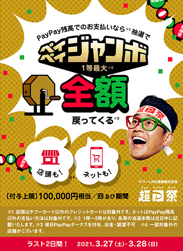 また、27日・28日はラストスパートとして最大全額が戻ってくる「ペイペイジャンボ」も実施される。一部を除くほとんどのPayPay加盟店が対象で、1等で100%、2等で10%、3等で1%が還元される。還元上限は10万円/回・期間と高額なので、狙ってみるのもよいだろう。