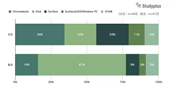 「1人1台端末」の機種は、公立高校ではChromebookやSurfaceが多く、私立ではiPadが多かった。