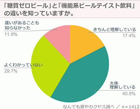 まず、「糖質ゼロビール」と「機能系ビールテイスト飲料」の違いを知っているかを聞いたところ、「大体理解している」が40.9%で最も多く、「きちんと理解している」と合わせると、半数以上が両者の違いを知っていた。しかも、6割の人がこれまでに「一番搾り 糖質ゼロ」または「パーフェクトサントリービール」を飲んだことがあった。