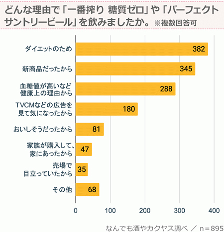 では、どんな理由で糖質ゼロビールを飲んだのか。複数回答可で聞いたところ、最も多かったのは「ダイエットのため」だった。その次に「新商品だったから」、「血糖値が高いなど、健康上の理由から」と続く。
