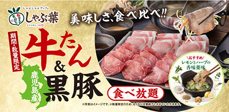 しゃぶしゃぶ食べ放題の「しゃぶ葉」では7月29日に「牛たん&鹿児島産黒豚食べ放題」が復活。9月2日まで提供する(数量限定で9月2日より前に終了する可能性もある)。対象メニューは「牛たん&鹿児島産黒豚食べ放題コース」(大人ランチ:2599円、大人ディナー:2999円、小学生ランチ:1759円、小学生ディナー:1979円)、「牛たん&鹿児島産黒豚&国産牛食べ放題コース&国産和牛食べ放題コース」(大人ランチ:2999円、大人ディナー:3599円、小学生ランチ:1979円、小学生ディナー:2199円)。