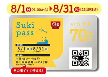 すき家は8月1日に店内でもテイクアウトでも牛丼・カレー・うなぎ・四川風麻婆丼・エビチリ丼が70円引きになる「Sukipass」の販売を開始した。Sukipassは200円で、買ったその日からすぐに使用することができる。有効期間は8月31日まで。1回の注文で3商品までが対象。パスポートはなくなり次第、販売終了となる。