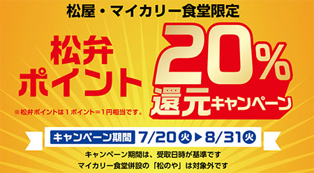 松弁ネットではPayPayとは別に独自の「20%還元キャンペーン」を開催中。8月31日まで通常10%のポイント付与が20%になるので、PayPayキャンペーンと合わせて、さらにお得だ。対象店舗は一部店舗を除く全国の松屋・マイカリー食堂。新規登録時は100ポイント付与されるので、始めるならいまがチャンスだ。