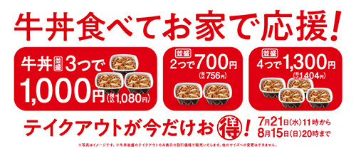 吉野家は「牛丼食べてお家で応援!テイクアウトが今だけお得!」を展開中。テイクアウトであれば、牛丼並盛×4で1404円、×3で1080円、×2で756円と通常よりお得に購入することができる。期間は8月15日20時まで。