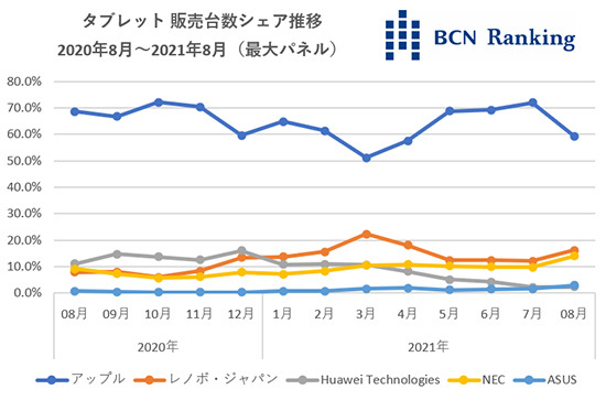 全国の家電量販店やECショップでPOSデータを集計する「BCNランキング」によると、2021年8月のタブレット端末の販売台数は前年同月比は56.5%。前月の79.6%からさらに低下した。巣ごもり需要の反動減に加えて、新型iPadの発売を前に買い控えの動きも出ているとみられる。