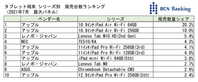 シリーズ別の販売台数シェアランキングでは、「iPad Air Wi-Fi 64GB」がトップを維持。Android勢もレノボの「Lenovo Tab M10 HD(2nd Gen)」が3位、NECの「TE510/KA」が4位と健闘している。またASUSが久しぶりにトップテン入り。「Chromebook Detachable CM3」が9位にランクインしている。(BCN・大蔵 大輔)