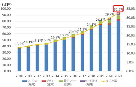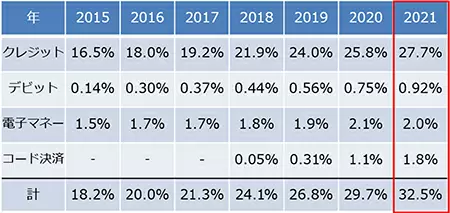 経済産業省は、キャッシュレス決済比率を2025年までに4割程度、将来的には世界最高水準の80%まで上昇させることを目指し、サービスの普及に取り組んでいる。6月1日に同省が公表した「2021年のキャッシュレス決済比率」によると、支払額ベースで32.5%だった。過去最大値で15年に比べると14.3ポイントアップした。