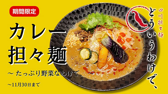 クロコの運営する「四川担々麺 どういうわけで、」で、「カレー担々麺~たっぷりな野菜なわけで、~」が発売となっている。販売は11月30日まで。体が芯から温まり、肌寒い季節にピッタリの一品だ。価格は1280円。