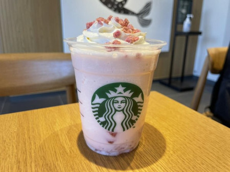さくら 咲くサク フラペチーノを飲んでみると、まずはフラペチーノとさくらジェリーのふんわりとした甘みが口いっぱいに広がった。さくらジェリーのぷるぷるとした食感がアクセントになり、どんどん飲み進めたくなるようなスッキリ感もある。