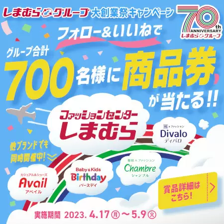 大創業祭では、とっておきのお買得商品や人気のキャラクター商品などを特別価格で提供する。特別価格の商品は、売切れ次第終了となる。また、4月17日からは、大創業祭を記念して、しまむらグループで抽選で700人に商品券が当たる「Instagramフォロー&いいね!キャンペーン」も実施する。
