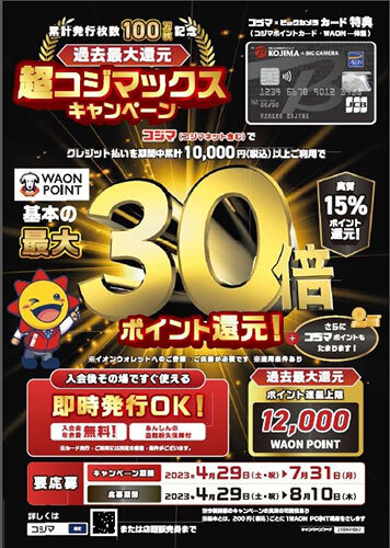 コジマは、4月29日(本日)からコジマ×ビックカメラカードの累計発行枚数が100万枚を達成したことを記念して「超コジマックスキャンペーン」を実施する。