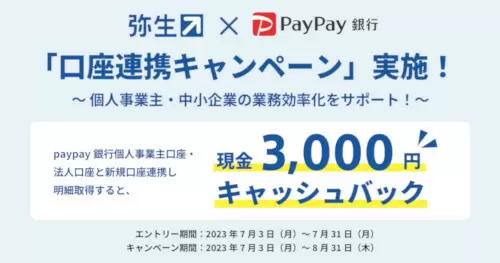 弥生は7月3日~8月31日の期間、PayPay銀行と「口座連携キャンペーン」を実施する。