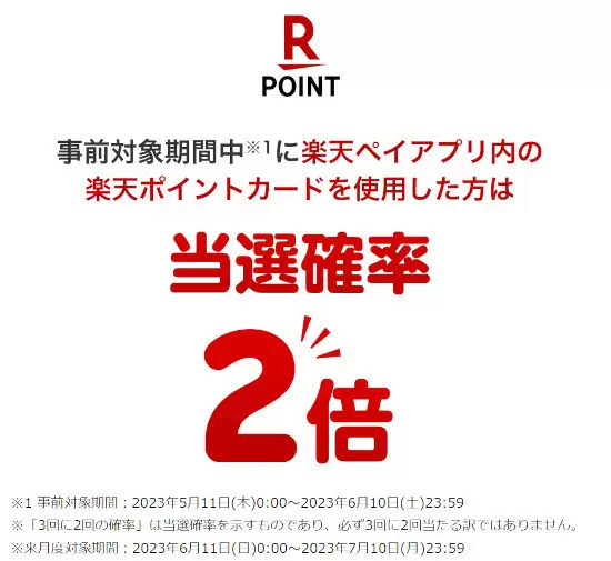 さらに、事前対象期間中に、楽天ペイアプリ内の楽天ポイントカードが利用できる店舗で楽天ポイントカードを提示していた場合、当選確率が2倍にアップする。