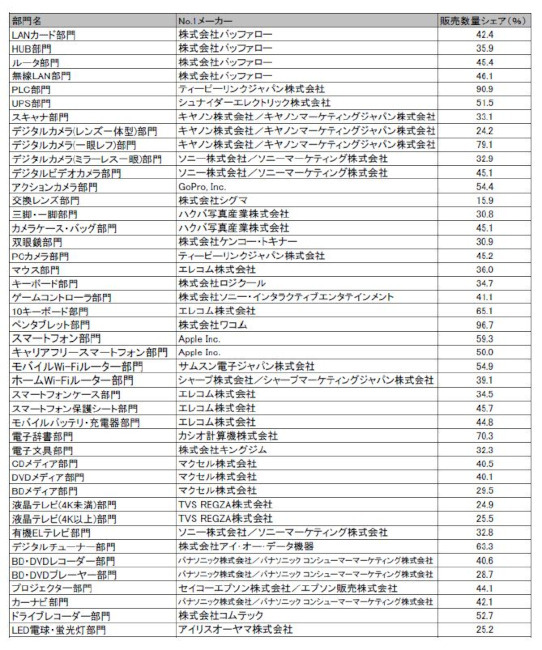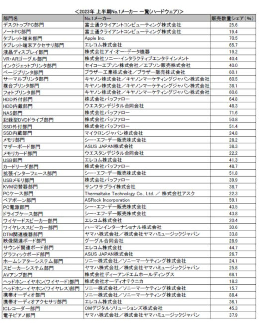 BCNは7月10日、デジタル家電の実売データを集計する「BCNランキング」に基づき、主要な111のカテゴリ(ハードウェア88、ソフトウェア23)について、2023年上半期(1月-6月)に最も販売数が多かった「上半期No.1メーカー」を発表した。