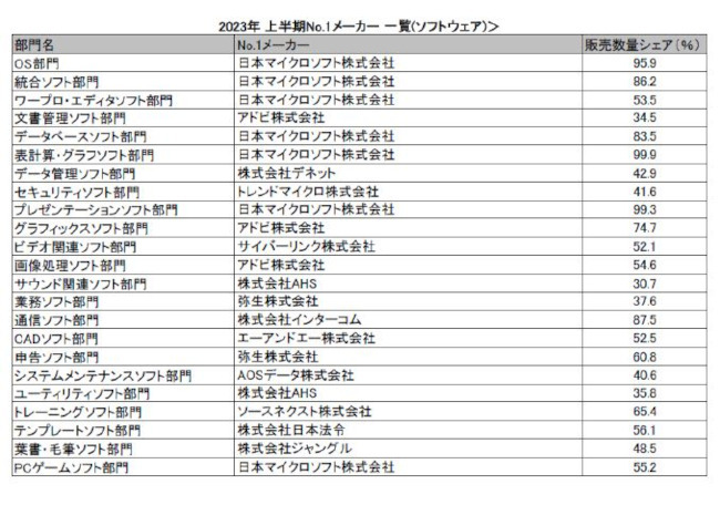 このほかの注目カテゴリは、「初音ミク」のヒット以来、クリプトン・フューチャー・メディアが12年連続でメーカー別年間販売数1位を獲得していたサウンド関連ソフト。23年上半期は、次世代歌声合成ソフト「Synthesizer V」向け歌声データベースが好調なAHSがシェア30.7%を占め、トップに立った。