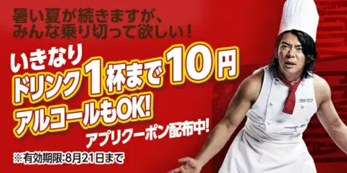 ペッパーフードサービスは8月15日から21日までの間、連日の猛暑を乗り切ってほしいとの考えで、「いきなり!ステーキ」公式アプリに登録している全会員にアルコールを含むドリンクを1杯まで10円で飲めるアプリクーポンを配布している。