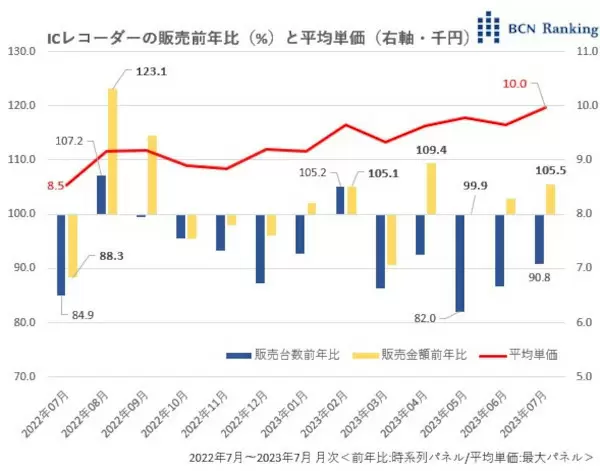 このところ、ICレコーダー市場は伸び悩んでいる。7月の販売前年比は、金額が105.5%と前年を上回ったが、台数が90.8%と前年割れ。2月には台数と金額がそろって前年を上回り、一旦回復の兆しを見せた。しかし、3月以降は再び台数の前年割れが続いている。デジカメと同様、ICレコーダーもスマートフォン(スマホ)に市場を奪われている機器の一つ。ちょっとした録音はスマホで完結するため、専用機ならではのメリットを消費者にどう示すかで苦戦している。