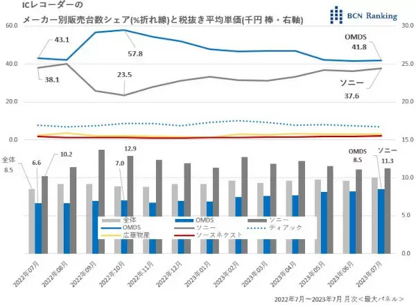 こうした単価変動は販売台数シェアにも大きく影響した。もともとトップシェアOMDSと2位ソニーは僅差でトップ争いを展開していた。特に昨年8月は、両者のシェアは2ポイント差まで接近するほどだった。しかし昨年9月の値上げをきっかけにソニーはシェアを失い、10月には23.5%まで下落。OMDSとの差が34.2ポイントまで開いた。しかし、その後徐々にシェアを戻し、OMDSと4.1ポイント差まで再接近してきた。一方OMDSは、昨年10月のピークに57.8%を記録。以降シェアは下降トレンドが続いているものの、この7月でも41.8%と、依然トップシェアを維持している。