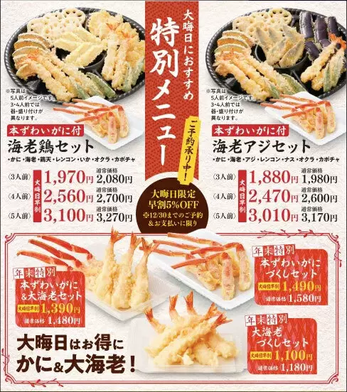 ほかにも、「本ずわいがにづくしセット」(価格は1580円、早割価格は1490円)や「本ずわいがに&大海老セット」(価格は1480円、早割価格は1390円)など、早割り対象商品を多数用意している。