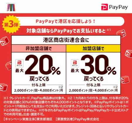 キャンペーン期間中、資本金5000万円以下の飲食・小売業の事業者・理容・美容・クリーニング店のうち、港区が指定する店舗でPayPay(クレジットまたは残高払い)で決済すると、購入金額に対して港区商連加盟店舗なら30%、未加盟店舗では20%のPayPayポイントを付与する。なお、PayPayカードでの支払いは「クレジット」以外は対象外。付与上限は1回あたり2000ポイント、港区商連加盟店舗・未加盟店舗ごとに1カ月あたり4000ポイント、キャンペーン期間全体は1万6000ポイント。
