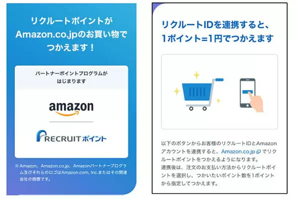 今回の、リクルートとAmazon.co.jpとの連携は、リクルートがアマゾンジャパンのパートナーポイントプログラムへ参画したことから実現したもので、リクルートIDとAmazonアカウントの連携が可能になり、Amazon.co.jpでの買い物の際にリクルートポイントが使えるようになった。リクルートポイントは、「じゃらんnet」「ホットペッパービューティー」「ホットペッパーグルメ」といったリクルートのサービスや、リクルートカードを利用することで貯められる。