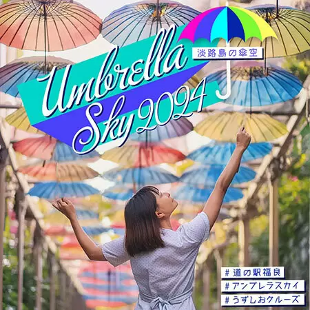 ジョイポート淡路島は6月21日~8月31日の期間、同社の運営する「うずしおクルーズ」の遊覧船が出航している道の駅福良(兵庫県南あわじ市)藤の棚街道において、約100本のカラフルなアンブレラが広がる「アンブレラスカイ2024」を開催する。