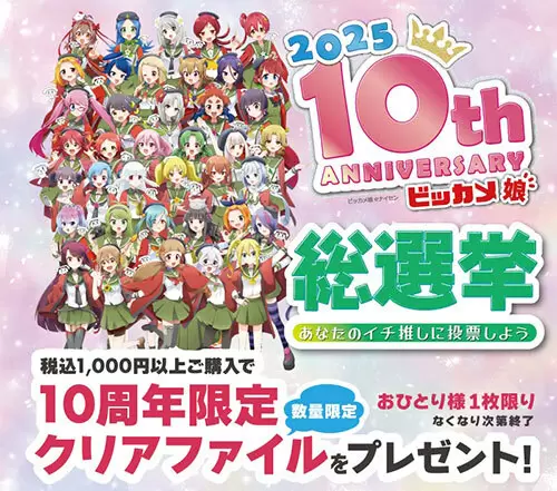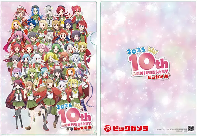 また、4月27日から「ビッカメ娘」擬人化店舗にて、1000円以上を購入すると、10周年記念限定クリアファイルがもらえる(当日レシートのみ有効)。クリアファイルは数量限定で、なくなり次第終了となる。