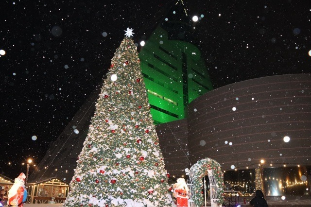 ・雪が舞う夕方のツリー&ねぶたピラミッドが映える時間帯。