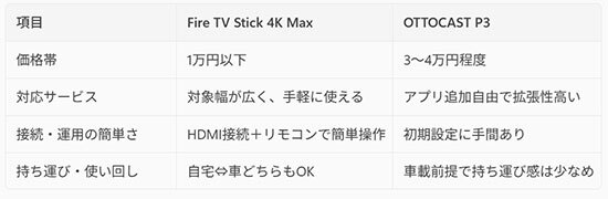 この環境を前提に、「Fire TV Stick」または「OTTOCAST」でどちらが車内エンタメに適しているか、比較してみました。