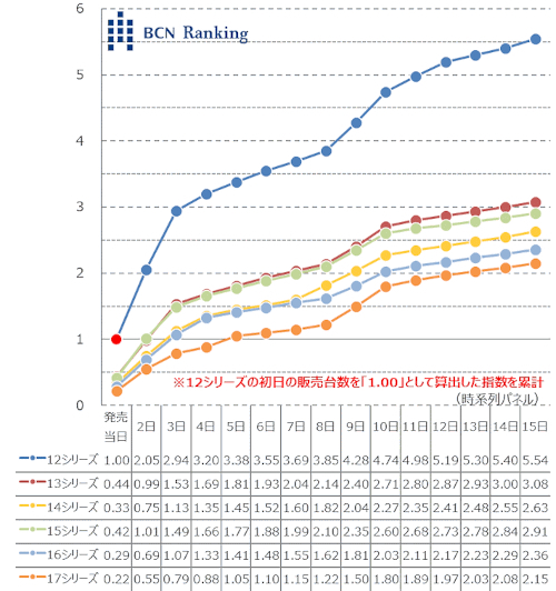 iPhone 12シリーズ('20/10/23発売:無印・Pro、'20/11/1発売:mini・ProMax)の発売当日の販売台数を「1.00」として、各シリーズの指数を算出。発売から15日間の初速を比較したところ、今年発売になった17シリーズは、12シリーズ以降、最も鈍い出足となった。なお、この初速比較はキャリア(au、docomo、SoftBank)が取り扱っているiPhoneのみを集計の対象としている。(BCN総研・森英二)