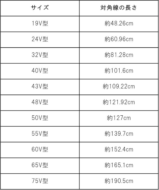 テレビのサイズは、「○V型」という表記をされます。これは、フレームを含まない画面の対角線の長さをインチで表した数字です(1インチ=約2.54センチメートル換算)。たとえば、対角線の長さが81.28cm(=32インチ)のテレビは、32V型と表記されます。