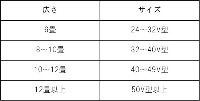 次は、部屋の広さとテレビのサイズの関係性についてみていきます。以下は、部屋の広さとおすすめのテレビのサイズです。目安として参考にしてください。