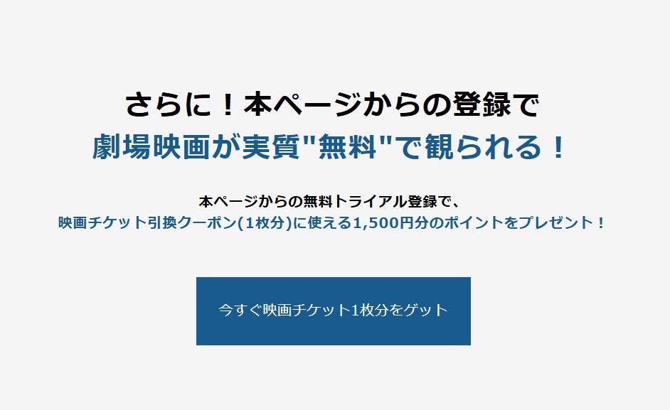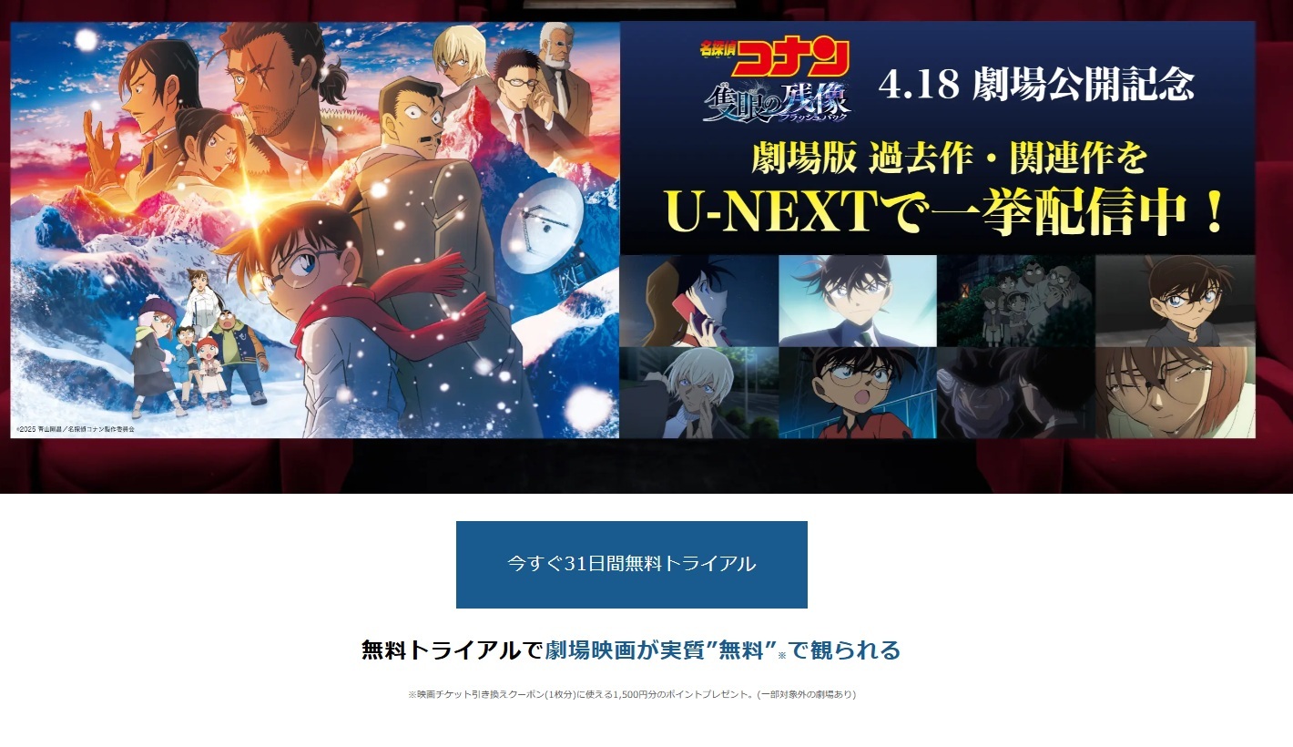 U-NEXTの無料トライアルに登録すると劇場版『名探偵コナン 隻眼の残像』映画チケットの購入に使える1,500ポイントプレゼントされます。この特典はかなり大きいです。