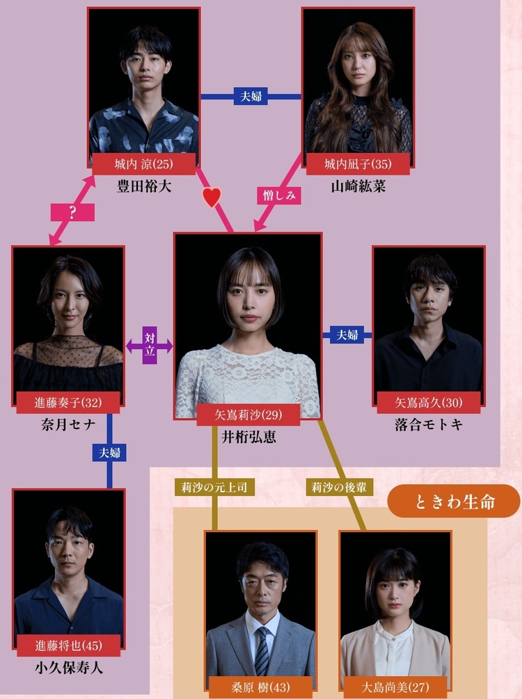 舞台となるのは、とあるマンション。そこには複数の夫婦が暮らしており、それぞれが歪んだ愛と秘密を抱えています。DVを振るう城内凪子(山崎紘菜)、マッチングアプリで裏の顔を持つ既婚者・進藤将也(小久保寿人)、その妻で“托卵”を企てる進藤奏子(奈月セナ)、さらにモラハラ気質を隠そうとしない医師・志沢匠(萩原護)など、一筋縄ではいかない人物ばかり。