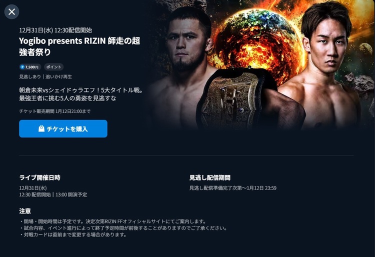 なお、過去の大会を見ても分かるとおり、PPVの料金設定は大会ごとに若干の違いがあります。そのため、正確な金額については、必ず該当大会の「PPVチケット販売ページ」で確認するのが安心です。 最新かつ正式な料金や販売条件は、U-NEXT公式サイトに詳しく掲載されていますので、購入前に一度チェックしておくことをおすすめします。