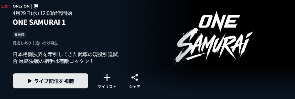 本大会を含むONE SAMURAIシリーズは、動画配信サービス「U-NEXT」で独占ライブ配信されます。U-NEXTはONEChampionshipと長期契約を結んでおり、今後も安定して視聴できる環境が整っているのが特徴です。