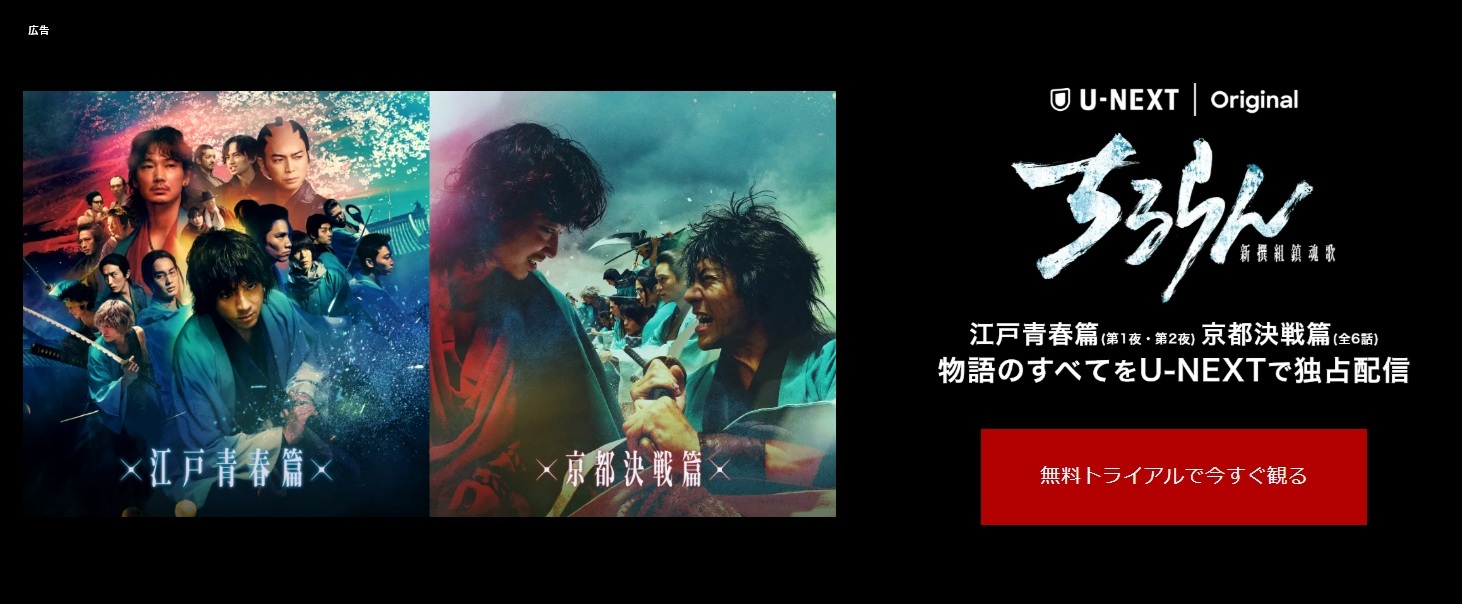 U-NEXTには初回限定で31日間の無料トライアルが用意されています。この期間中は対象作品が見放題なので、うまくタイミングが合えば『ちるらん』を実質タダで楽しむことができます。さらに登録時にポイントがもらえるため、原作漫画や関連する時代劇作品にも使えて一石二鳥です。 現在『ちるらん 新撰組鎮魂歌』のドラマを配信しているのは、実質U-NEXTのみです。他の主要な動画配信サービスではほとんど取り扱いがなく、2026年2月時点ではU-NEXTが独占に近い状態となっています。今後他のサービスでも配信される可能性はありますが、今すぐ見たいならU-NEXTが唯一の選択肢と言えます。